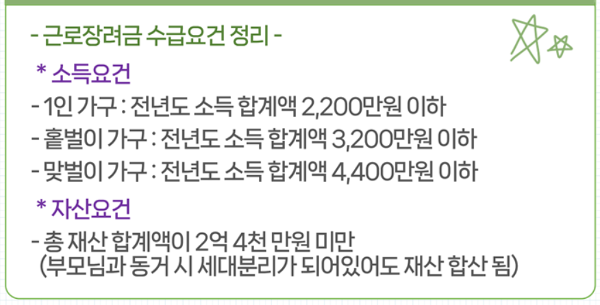 근로장려금은 다음의 요건을 모두 충족하는 근로소득, 사업소득 또는 종교인소득이 있는 가구를 대상으로 합니다. 첫째, 2024년 부부합산 연간 총소득이 가구원 구성에 따라 정한 총소득 기준금액 미만이어야 합니다. 둘째, 2024년 6월 1일 현재, 가구원 모두가 소유하고 있는 주택·토지·건물·예금 등 재산 합계액이 2.4억 원 미만이어야 합니다.