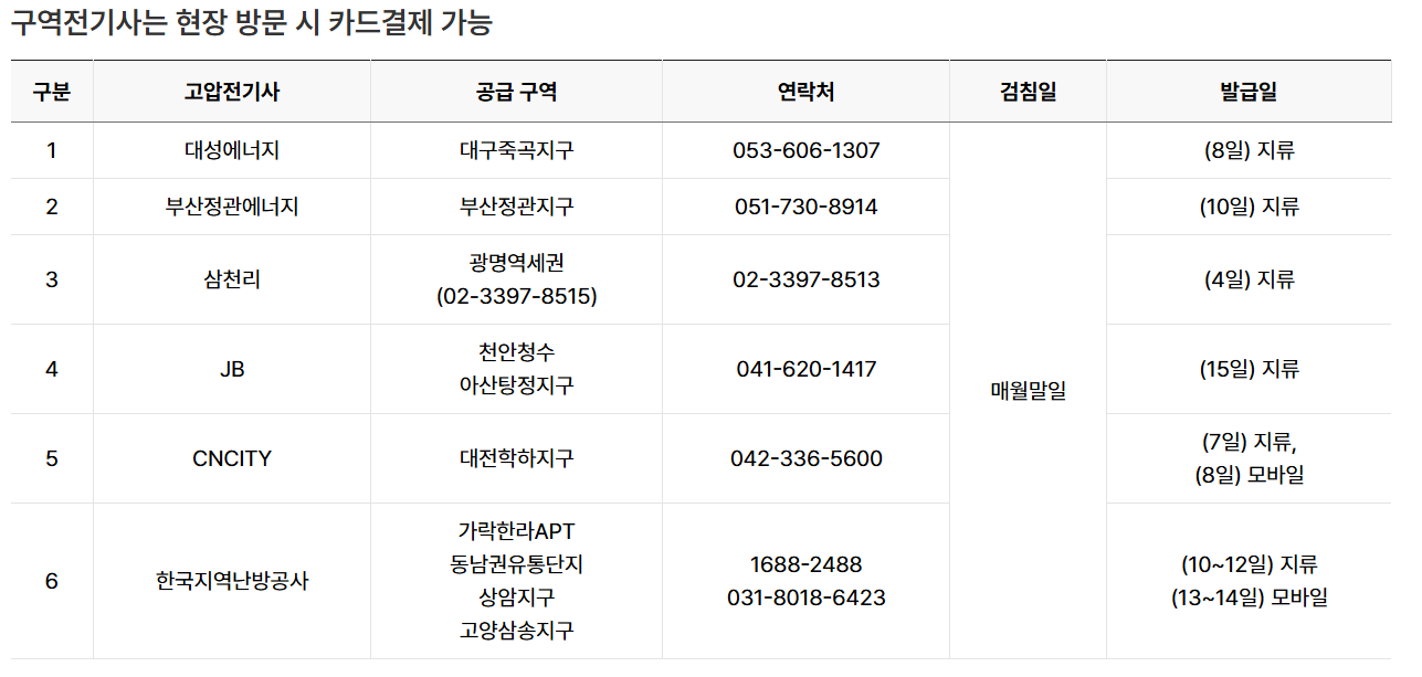 | 2 | 수도권 | 예스코 | 1544-3131 | lsyesco.com | ∎홈페이지 및 고객센터 카드납부 가능 ∎자동결제 카드납부 가능 * 가정용에 한함 |